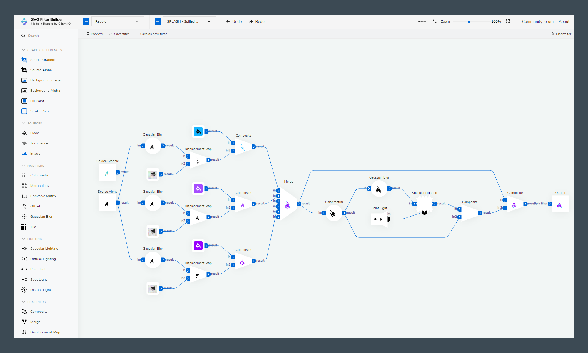 Use the drag&drop Designer to combine filter primitives.